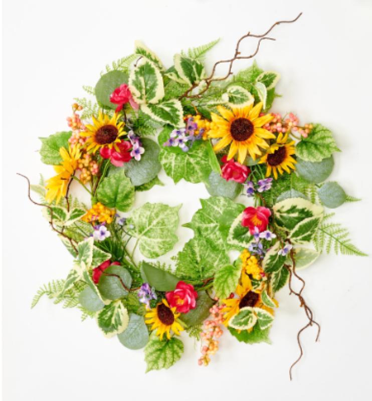 Welcome sunshine and color into your home with this vibrant floral wreath, bursting with sunflowers, ivy, and pops of red roses and lavender blooms. This lush mix of textures and colors is perfect for spring through early fall, and will instantly brighten your entryway, porch, or interior space. Approx. 18-22 in. in diameter.