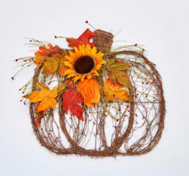 Welcome autumn with our natural looking vine Pumpkin. Over the twig silhouette are fall Maple leaves, berries, velvet gourd and friendly Sunflower. Perfect to hang on any door or wall.