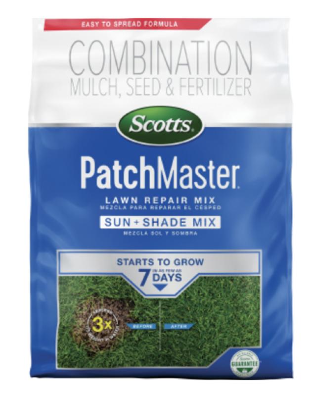 Scotts® PatchMaster® Lawn Repair Mix Sun + Shade Mix is an easy to spread formula that starts to grow in as few as 7 days. Absorbs 3x its weight in water to keep the seeds moist. Feeds up to 6 weeks. All-in-one bare spot repair. 4.75 lbs treats Bare spot: 70 sq. ft. / Thin area: 140 sq. ft.; 10 lbs treats Bare spot: 145 sq. ft. / Thin area: 290 sq. ft.