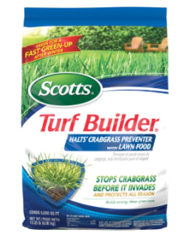 Scotts Turf Builder Halts Crabgrass Preventer with Lawn Food pre-emergent weed killer plus fertilizer stops crabgrass before it invades and protects all season long. It also prevents other listed grassy and broadleaf weeds, including barnyard grass, foxtail, Poa annua, chickweed, and oxalis. The added fertilizer feeds for a fast green-up after winter and helps build strong, deep grass roots. Apply in early spring prior to 3rd or 4th mowing when your lawn is dry and before temperatures are regularly in the 80s. Manufacturer recommends using a spreader to apply this product. For Scotts broadcast/rotary spreaders, use a setting of 3. For Scotts drop spreaders, use a setting of 6. For best results, the lawn should receive 1/4 In. of water from rainfall or watering within 2 to 3 days after application. Rain, snow, or freezing conditions after application will not affect the performance of this lawn care product. Do not apply to Dichondra and Bentgrass.