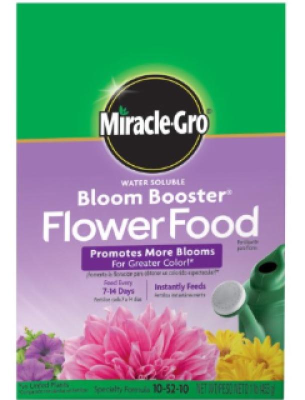 Formulated for beautiful blooms, Miracle-Gro Water Soluble Bloom Booster Flower Food promotes more blooms for greater color (vs. unfed plants). Our flower fertilizer feeds instantly to promote quick and beautiful results. It is great for use on all types of annual and perennial flowers, including hydrangeas, zinnias, petunias, dahlias, peonies, sunflowers, pansies, and daylilies. For best results, feed every 7 to 14 days when plants are actively growing. Miracle-Gro Water Soluble Bloom Booster Flower Food can easily be applied with a watering can or Miracle-Gro Garden Feeder.
