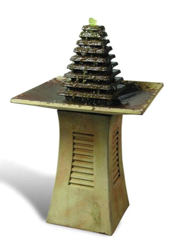 Taking its inspiration from the beautiful, symmetrical tiered design common to pagodas in East Asia, the Astor Fountain will add a stylish zen to any space. Beautifully hand crafted with cast stone and available in 21 finishes, this piece is an art form in itself with its clean lines, opulent color and detail. Featuring a sharp angled basin that stands in stark contrast to the usual rounded fountain design, this fountain also features a tower made of rectangular discs from which water flows freely from its top down into the plate basin. Fill your garden, yard, deck or patio with the beautiful, tranquil sounds of flowing water with this unique and effortlessly chic Astor Fountain.