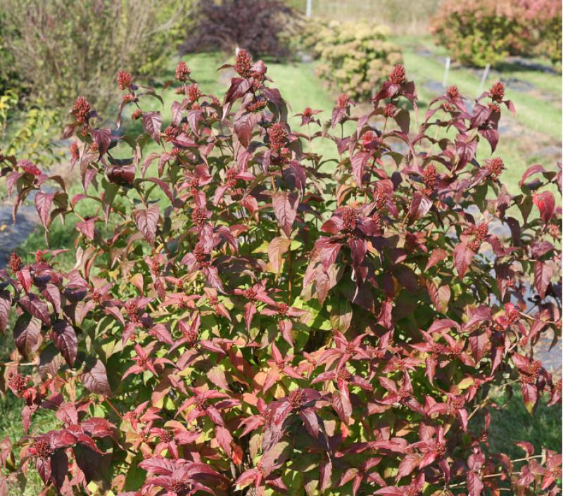 Diervilla just got a lot more colorful: this tough, easy-growing shrub is a standout with its dark burgundy-black foliage. The color is especially intense in spring and autumn. The bright yellow flowers add contrast in early summer. This is a durable native that thrives in sun or shade, and is a very useful landscape plant.