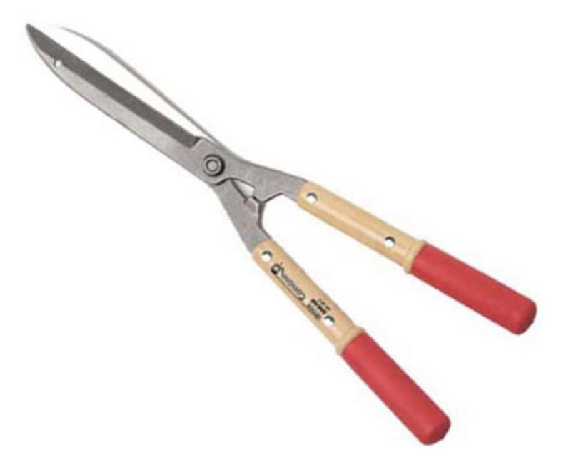 Hedge shear with resharpenable, forged Coronium steel alloy blades. Fully heat-treated for strength. Precision-made pivot bolt. Limb notch. Top-grade hardwood handles. Comfortable, non-slip grips.