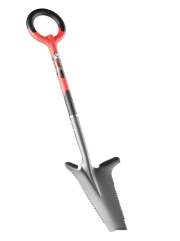 Is a multi-purpose shovel that acts as a shovel, root hatchet, and root saw all in one tool. Tempered mid-carbon steel blade, polypropylene encased carbon steel shaft, and thermoplastic elastomer grip. 13" blade length. 10.5" blade width at top of step. 44.5" total length.
