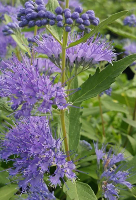 Caryopteris clandonensis 'Dark Knight' (Bluebeard) blooms with a profusion of dark blue flowers in late summer when few other shrubs are flowering. Its modest size makes it very useful in smaller yards. A fantastic nectar source for bees and butterflies. Drought resistant/drought tolerant plant (xeric).