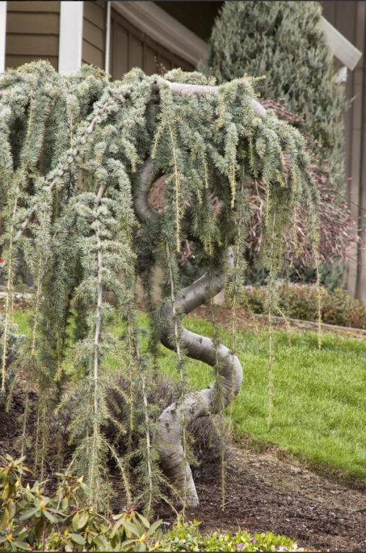 This dramatic weeping evergreen makes a special addition to any landscape. Superb specimen for minimal-care gardens. Naturally slow-growing with a sprawling horizontal habit, though often trained into an upright, serpentine form. Pendant branchlets display icy-blue needles, creating a graceful, waterfall-like effect.