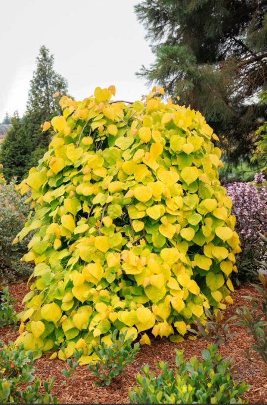 Lavender-pink spring blooms are followed by new leaves tinged with orange, becoming bright golden. A unique color for weeping varieties, the foliage holds up well in sun and heat. The tall, narrow form is the perfect accent for small spaces.