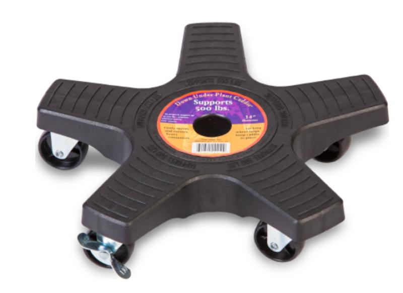Plant caddie made of UV resistant plastic and features five high quality, durable nylon and steel wheels. One locking caster keeps caddie securely in place.