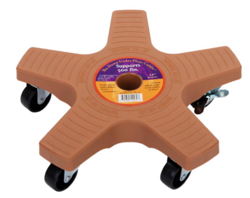 Plant caddie made of UV resistant plastic and features five high quality, durable nylon and steel wheels. One locking caster keeps caddie securely in place.