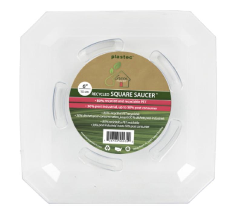 Made from 100% recycled PET, this clear plastic saucer can hold both square and round planters. Retains water and protects floors.