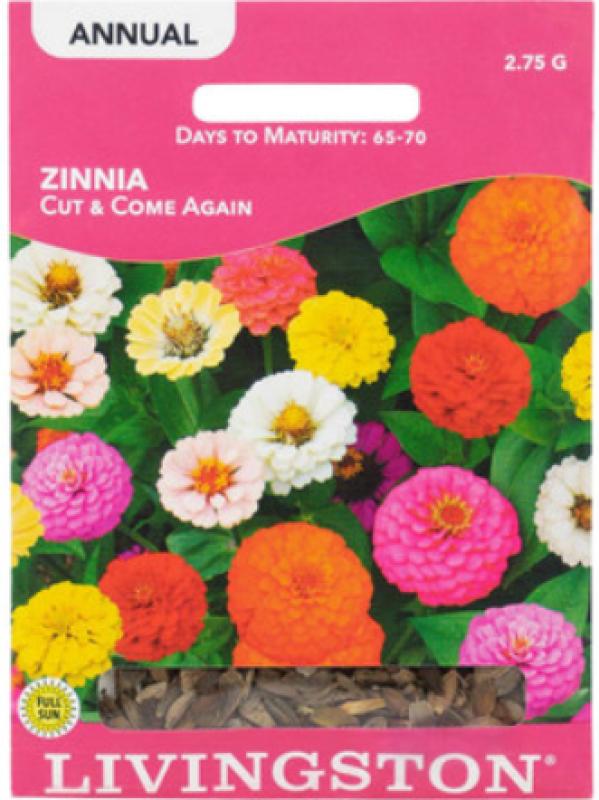 The Livingston Zinnia Cut and Come Again mix is a popular variety of Zinnia elegans known for producing continuous, abundant blooms on sturdy, long stems throughout the summer until the first frost. The "Cut and Come Again" name describes the plant's response to harvesting; cutting the flowers encourages the plant to produce more blossoms, making it ideal for cutting gardens. This mix offers a wide color range, including pink, scarlet, yellow, orange, and cream.