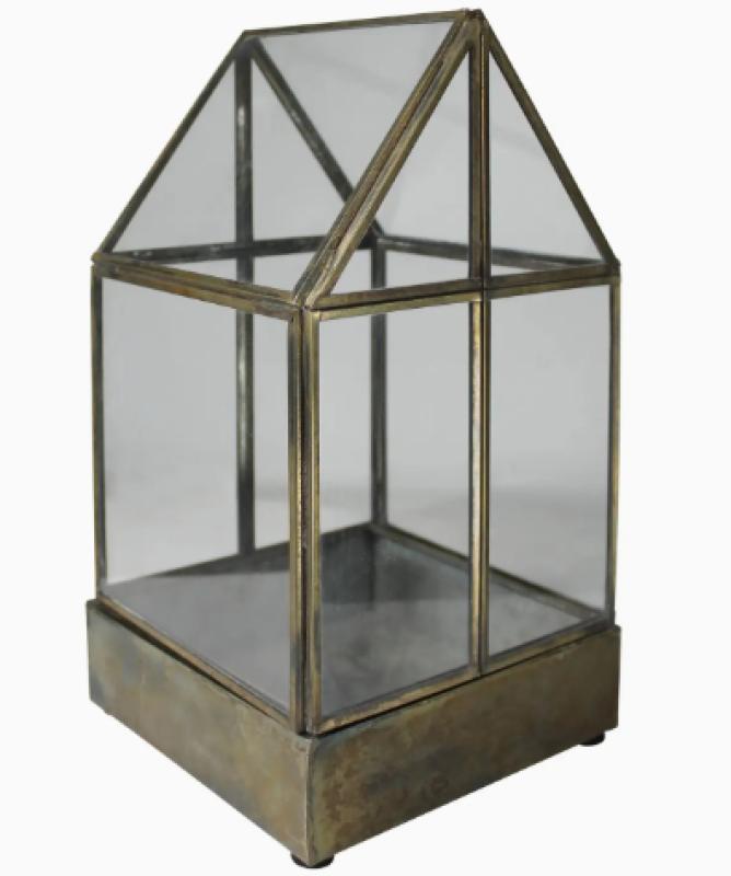 A simple leaded glass house with a gable roof that lifts off a galvanized base provides copious charm and endless opportunity to create a small-scale enclosed environment of plants, moss and rocks. Weight: 2.6 lb (1.18 kg) Dimensions: 6 x 6 x 12 in (15.2 x 15.2 x 30.5 cm)