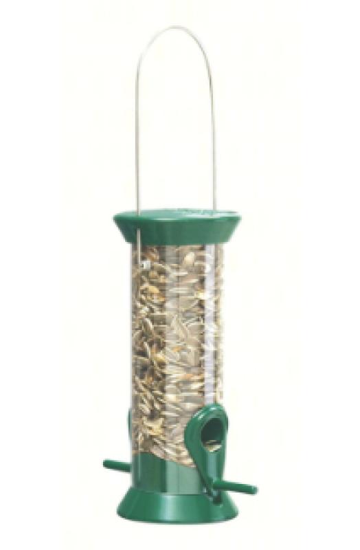The Green Metal Seed Feeder is a patented baffle that features a powder coated, zinc die cast tops, durable bases and ports, and a stainless steel wire. It also has a snug-fitting sliding cap. Feeder is 8" Long and is 2.5" in diameter. It has a 1/2Lb seed capacity.