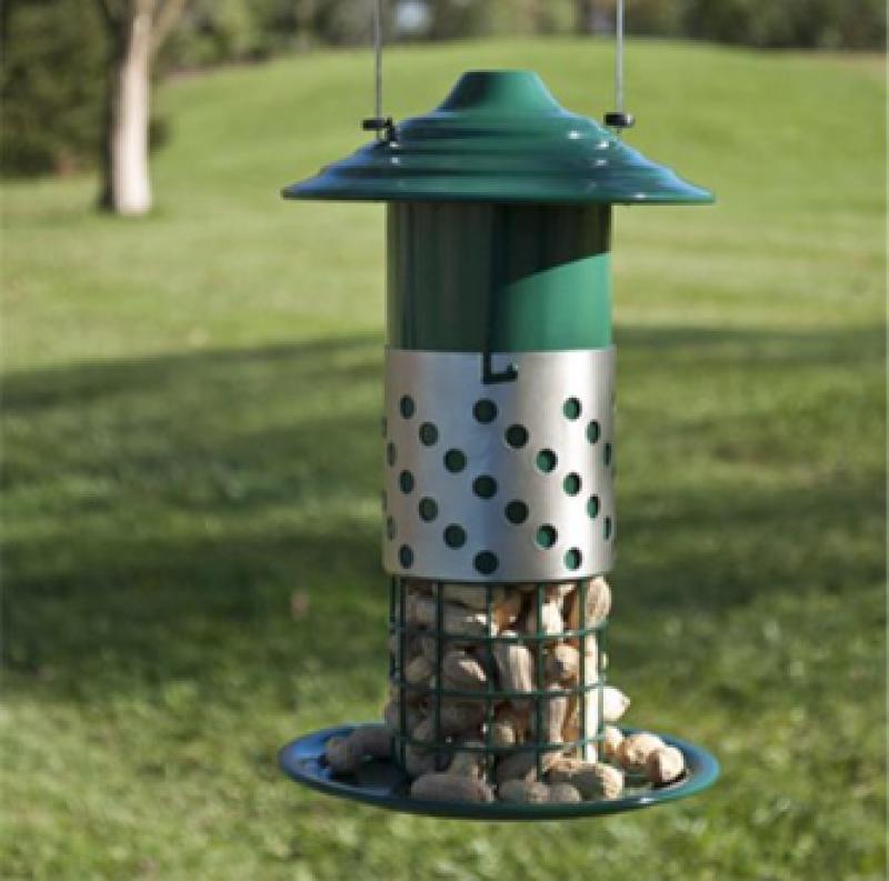 Attract more birds with this low maintenance multi-functional feeder for meal worms peanuts and suet balls. The stainless steel sleeve slides up to reveal a hopper fill with either shelled peanuts.