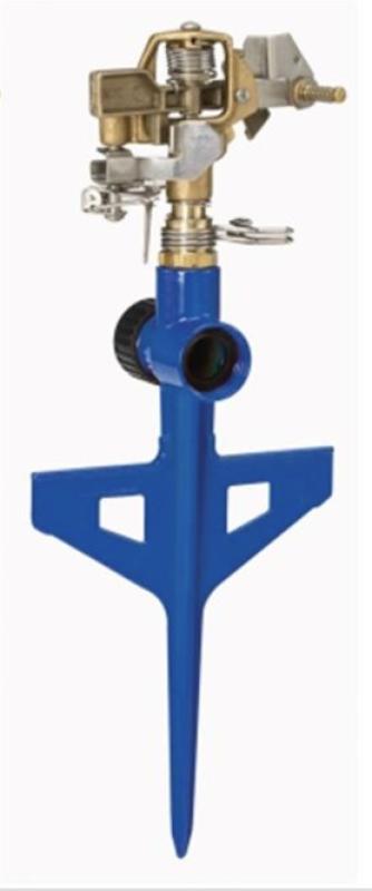 This vibrant blue impulse sprinkler stakes directly into your lawn and delivers a sweeping circular spray—covering up to a 70-foot diameter—with a robust brass head mounted on a sturdy metal stake. Its durable build ensures reliable performance, making it a practical choice for efficient and long-lasting garden watering.