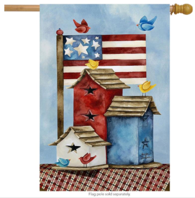 The Freedom Birdhouse Spring House Flag measures 28 x 40, Artwork is printed on polyester material designed for outdoor display. Artwork is correctly readable on one side.