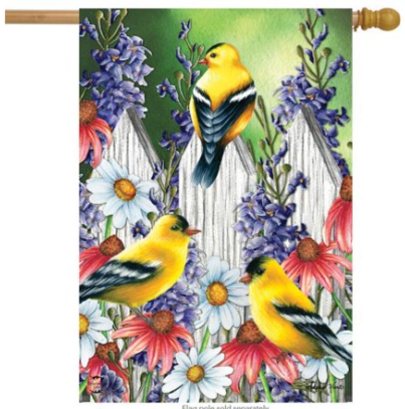The Goldfinch Trio Spring House Flag measures 28 x 40, Artwork is printed on polyester material designed for outdoor display. Artwork is correctly readable on one side.
