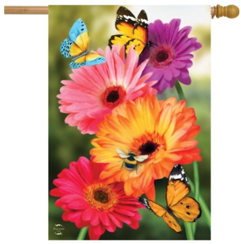 The Garden Gerer Daisies Spring House Flag measures 28 x 40, Artwork is printed on polyester material designed for outdoor display. Artwork is correctly readable on one side.