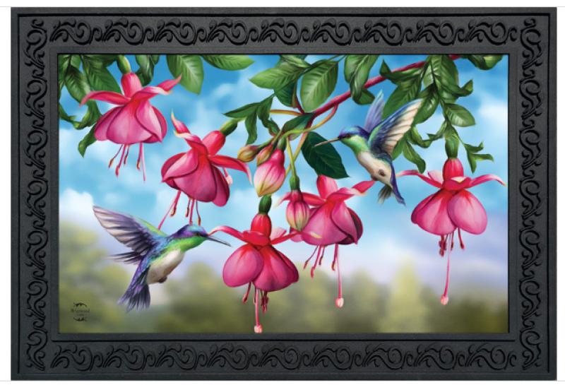 This Flight of The Hummingbirds Spring Floral Doormat is printed on polyester material with a non-slip rubber backing. It measures about 18 x 30.