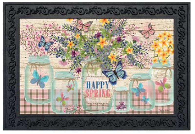 This Happy Spring Mason Jar Doormat is printed on polyester material with a non-slip rubber backing. It measures about 18 x 30.