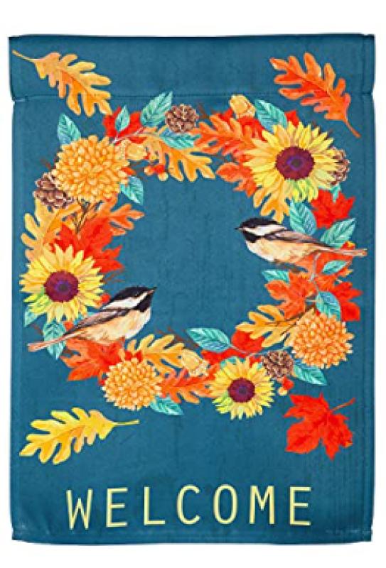 A pair of chickadees are perched on a fall wreath in the colorful design of this Fall Chickadee Wreath House Suede Flag. Made of durable material for long-lasting use and is weather resistant. Makes a great gift too. 2-1/3 Ft. X 3-2/3 Ft