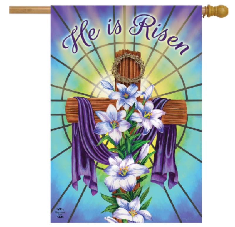 The Religious Easter Cross House Flag measures 28 x 40, Artwork is printed on polyester material designed for outdoor display. Artwork is correctly readable on one side.