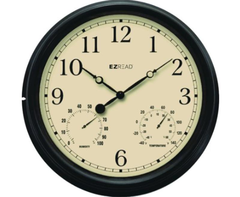 15 In. Black Plastic Indoor/Outdoor Clock with Thermometer and Hygrometer. Separate temperature and humidity dial read-outs. Displays temperature in Fahrenheit and Celsius degrees. Weather resistant. Clock uses 1 AA battery (not included).