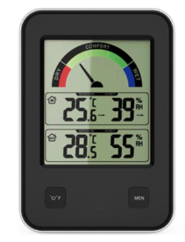 Digital Wireless temperature and humidity gauge. Color comfort meter makes it easy to read. Offers indoor and outdoor temperature and humidity.