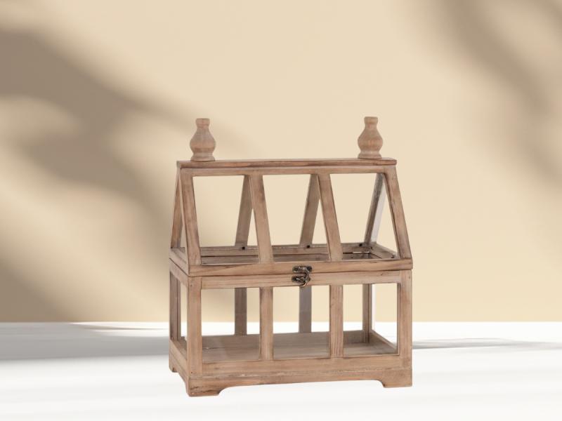 Natural wood finish exudes warmth and timeless appeal, while the clear glass panels provide a viewing window for plants or decorative items.