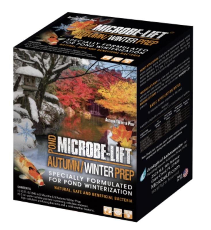 Microbe-Lift Autumn/Winter Prep helps accelerate the decomposition of leaves, sediment and other organic matter during the fall and winter months and will also jump start your pond's health in the spring. Microbe-Lift Autumn/Winter Prep is a two-part system of liquid bacteria and dry, water soluble packets containing a blend of cellulase enzymes, cellulase-producing bacteria and a cold weather bacteria. The cellulase enzymes, along with the cellulase-producing bacteria, are the key to accelerating the breakdown of leaves, organic sediment and sludge all winter long. The cold weather bacteria and liquid bacteria take care of the initial breakdown by-products. Continues to provide sustained biological activity even in water temperatures under 40F (4C.) If frozen, bacteria will remain effective after thawing out. Effective in darker conditions (under ice and snow). Helps to maintain a healthy immune system for your fish during the winter months.