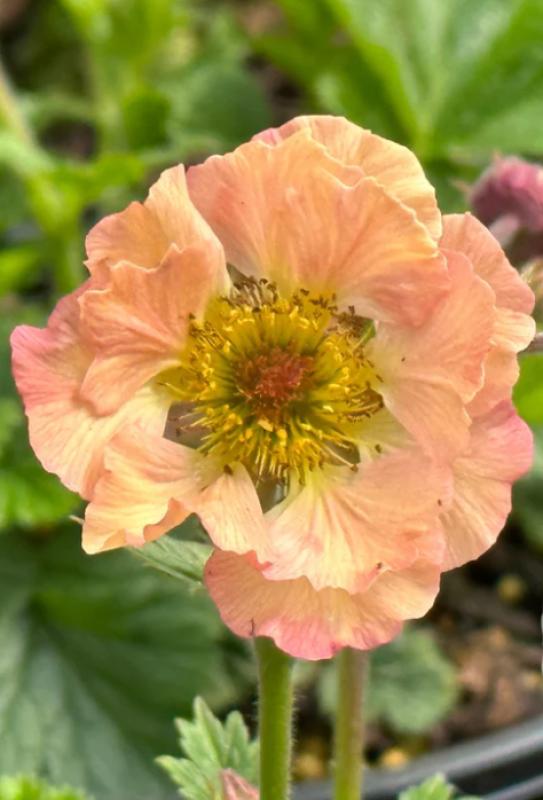 Geum 'Mai Tai' is an herbaceous perennial that is excellent for rock gardens, borders, beds, urban growing, cut arrangements, and container growing. Lovely 1" diameter flowers of coral, orange, peach and pink petals surround a bright yellow center. The deep crimson stems and contrasting rich green foliage create a uniquely attractive character.