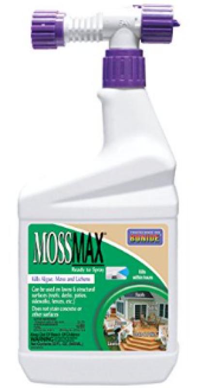 his product is a fast-acting moss, algae, and lichen killer for use on lawns, roofs, patios, fences, bark mulch, and driveways. This product will not stain concrete or other surfaces and a single application will control moss and algae for several months to one year. Convenient hose-end bottle is ready to spray. Just attach this bottle to your garden hose. Water automatically mixes with concentrate as you spray.