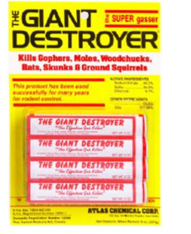 All-Weather:, Animal Type: Gophers and Moles, Brand Name: Atlas, Container Size: 4, Indoor or Outdoor: Outdoor, Number in Package:, Packaging Type: Carded, Product Form: Fog, Product Type: Gasser, Safe for Pets: Yes, Sub Brand: The Giant Destroyer.