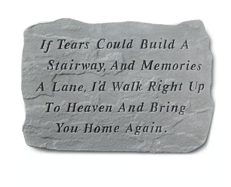 This memorial stone is a beautiful way to pay tribute to your loved one. Featuring inspirational words that read “If tears could build a stairway, and memories a lane, I’d walk right up to heaven and bring you home again”. Made of cast stone. Size: 18.5" x 9.5".