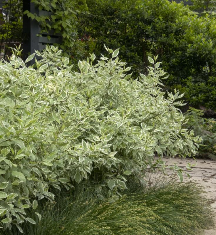 A suckering shrub to 1.5m in height with colourful slender stems, especially on the sun-facing side, green or brown-red to purple, ageing greyish green-brown. Variegated leaves are ovate, entire with a round base and pointed tip, green with splashes of white and creamy yellow on the margins, turn red in the autumn. Both surfaces have hairs. Small, creamy yellow, insect attracting flowers are borne above the leaves followed by hard black berries which are attractive to birds.