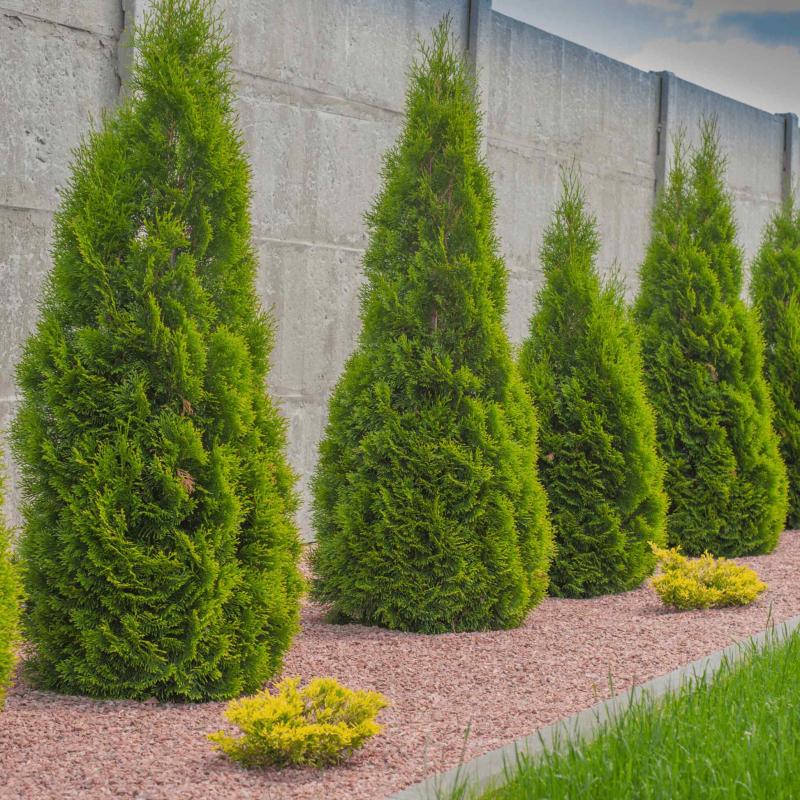 The Emerald Green Arborvitae is a popular, compact evergreen known for its naturally tight, upright habit and vibrant green foliage that holds its color beautifully year-round. At 8–9 feet tall, these specimens are ideal for creating an instant privacy screen, windbreak, or formal evergreen hedge.