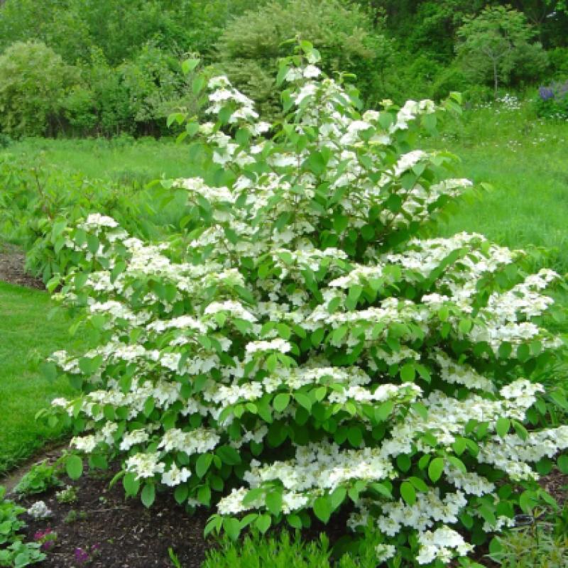 The Viburnum Plicatum Var. Tomentosum 'Mariesii' - 'Mariess' Viburnum, also called the wedding cake bush and Doublefile Viburnum, is a large, multi-stemmed, wide, rounded forming shrub. Horizontal branches give a beautiful tier look, large white lacecap-like flower clusters and sharp toothed, oval, dark green leaves.