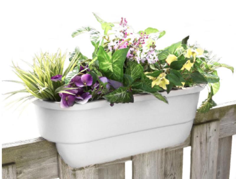 The Original Dual Deck Rail Planter! Bring the beauty of your flowers to your deck or patio with this Deck & Fence On-Rail Planter. Designed to fit both a 4" or 6" rail width. Drain holes prevent excessive watering. No tools required for installation.