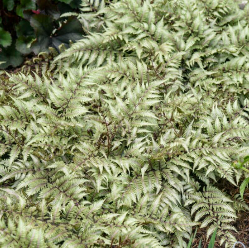 It forms a massive, arching clump of silvery fronds with green highlights and dark purple stems. Like the Lady Fern, ‘Godzilla’ spreads slowly where it is happiest in moist, loamy soils.