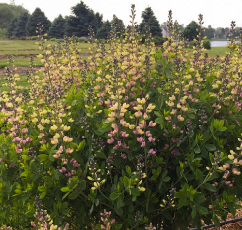 Soft yellow flowers appears atop the compact clump of deep blue-green foliage in spring. The flowers age to dusty raspberry purple, showing both colors at the same time.