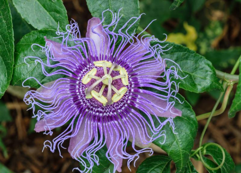 A charming passionflower vine in a 5″ nursery pot, already twining around a support trellis. Perfect for patios, fences, or small garden spaces. Delivers exotic blooms from spring through fall.