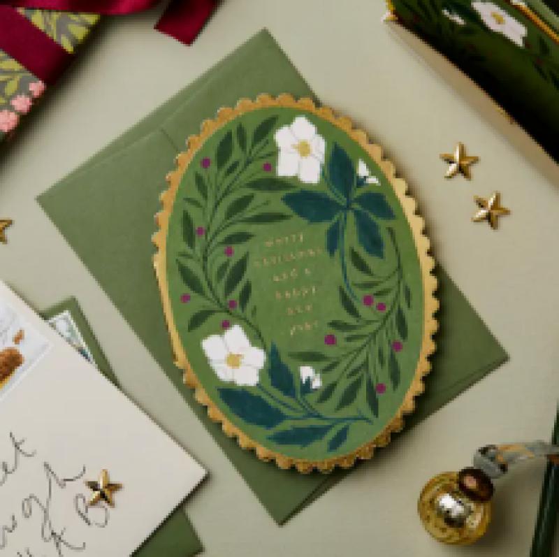 A beautiful oval card with golden scallop edging. A floral wreath design adorns this card, featuring festive berries and a white hellebore. The gold foil text in the center of the card reads 'Merry Christmas and a Happy New Year'. Paired with a complementary forest green envelope.