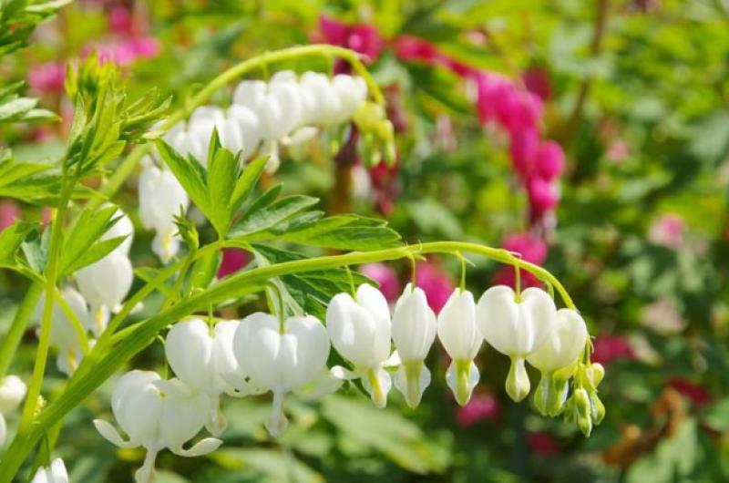 Dicentra s. 'Alba', also known as Old-Fashioned Bleeding Heart 'Alba', is a herbaceous perennial with white, heart-shaped flowers that blooms in late spring to early summer. It prefers partial to full shade and a rich, moist, well-drained soil, and its foliage often goes dormant by midsummer. For best results, plant it among other perennials like hostas or ferns to fill in the gaps.