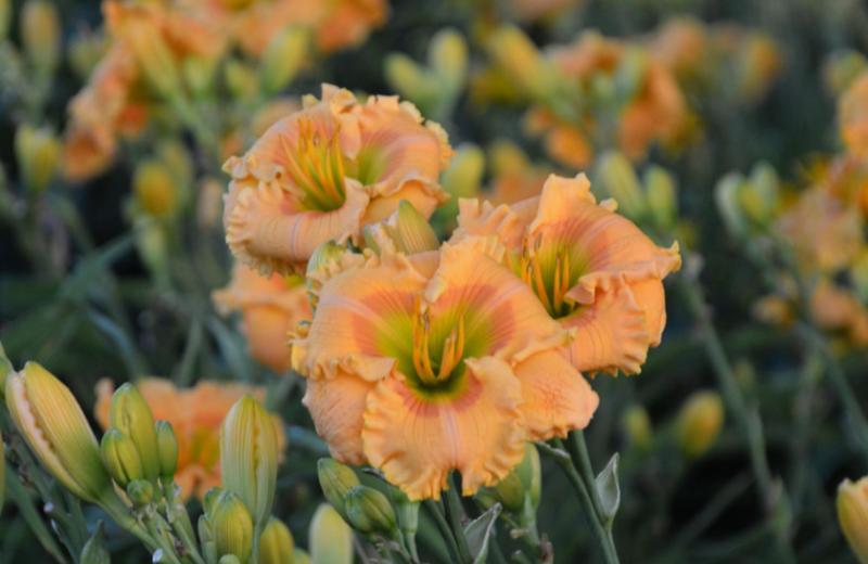 Orange mango petals with a light rose band are borne on strong, well-branched, heavily budded scapes. Flowers appear in midsummer and again later in the season.