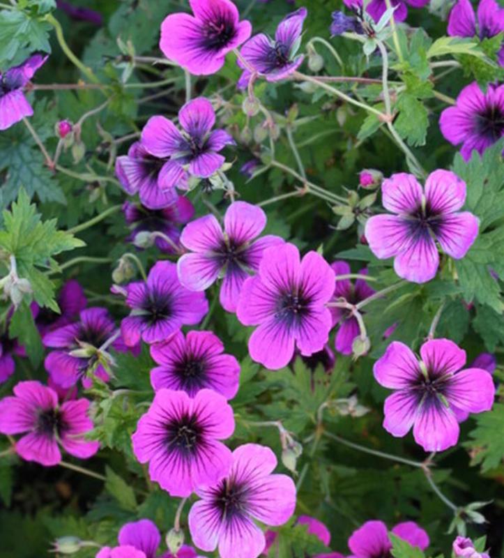 Geranium 'Dragon Heart' is a Geranium psilostemon x procurrens hybrid from geranium guru Alan Bremmer, of Scotland, that forms a 2' tall x 3' wide, insanely vigorous clump topped with an abundance of 2" wide magenta-purple flowers, each highlighted by a nearly black center. The flowers start in late spring and continue well throughout the summer in cooler climates. Geranium 'Dragon Heart' has held up amazingly well in our hot, humid summers.