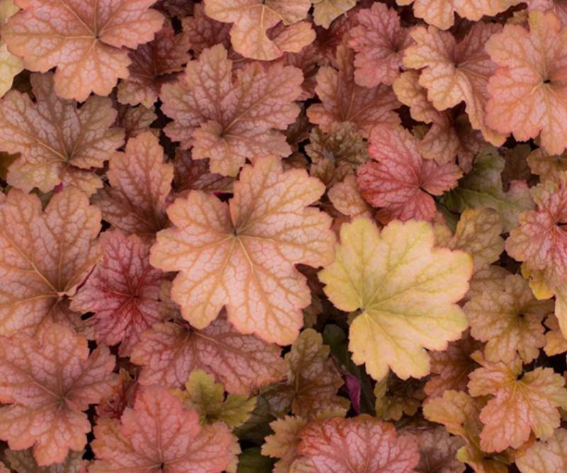 Coral Bells Carnival Watermelon foliage has soft tones with leaves in colors of peach, pinks and green with hints of pink popping from the underside. Petite white bell shaped flowers arise on long stems from the base of the plant in early to mid summer. This evergreen perennial is easy to grow, deer resistant and requires very little maintenance.