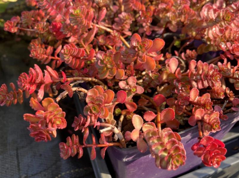 Sedum spurium ‘Rock Candy’ is a red ground hugging plant with a vigorous growth habit. Plants emerge with red foliage in spring. In July, the plants bloom rose pink. The short clumping plants only reach around 3-4” tall and around 12” wide or more. It prefers a well drained soil in full sun. The hardiness is zone 3-9 and can it be planted in spring, summer or fall. This new Sedum combines nicely with other low growing Sedums like Sedum spurium ‘John Creech’ and ‘Leningrad White’.
