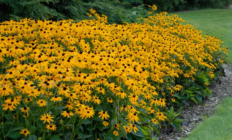 Rudbeckia 'Goldsturm', or Goldsturm Black-Eyed Susan, is a hardy, North American native perennial known for its radiant yellow, daisy-like flowers with prominent dark brown centers that bloom from mid-summer to early fall. It is a low-maintenance plant that tolerates various soils, prefers full sun, and is resistant to deer. 'Goldsturm' is an excellent choice for perennial borders, wildflower and pollinator gardens, and can be grown in containers.