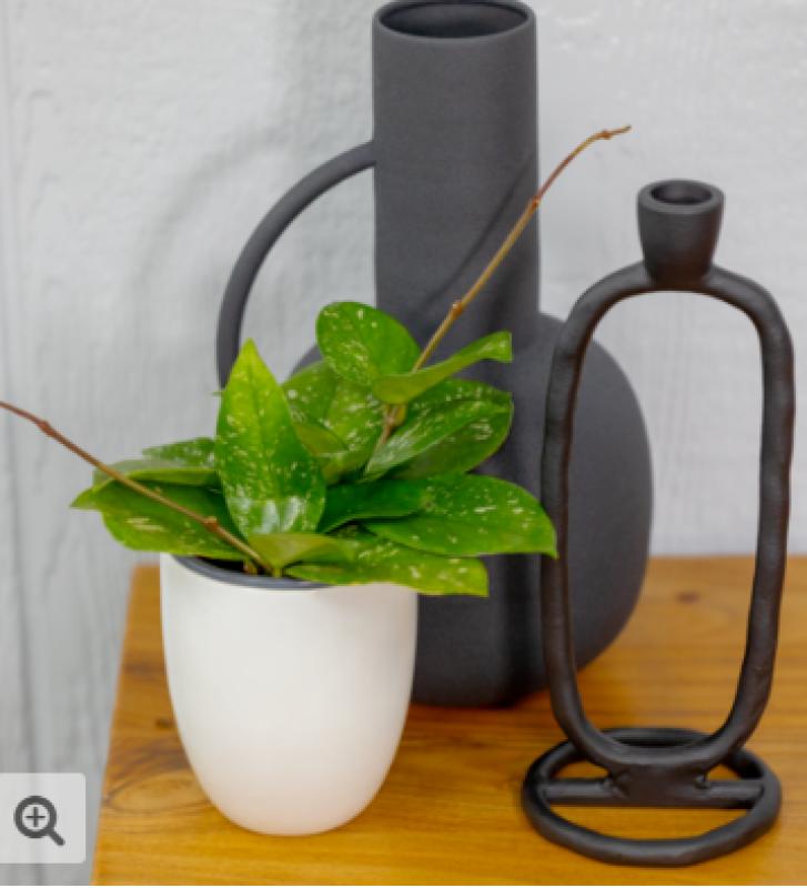 Introducing Hoya ‘Freckled Splash’–a variety of wax vine with large, almond-shaped leaves of dark green that exhibit heavy splashing. This sought-after “splashing” is a silvery flecking caused by air getting trapped in between the leaves, and will be most prominent if you position your ‘Freckled Splash’ in bright, indirect light. On rare occasions, when ‘Freckled Splash’ blooms, you will be greeted with clusters of pale pink flowers with red centers. When your ‘Freckled Splash’ is done blooming, however, be careful not to cut away the spent flower peduncles, as this variety of hoya is a rebloomer.